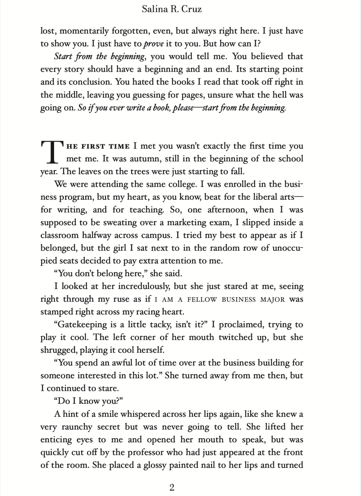 Beautiful. Authentic. Raw. Emotional. These are the words that describe this book. Salina’s writing style is so beautiful and easy to follow. I found myself re-reading multiple paragraphs and sentences just because of how beautifully written & descriptive they were. I finished this book a few weeks ago, and I still find myself thinking about it. I felt as if I knew these two characters personally by the end of the book and if I had walked alongside them in their journey. This was a heartbreakingly beautiful book.
